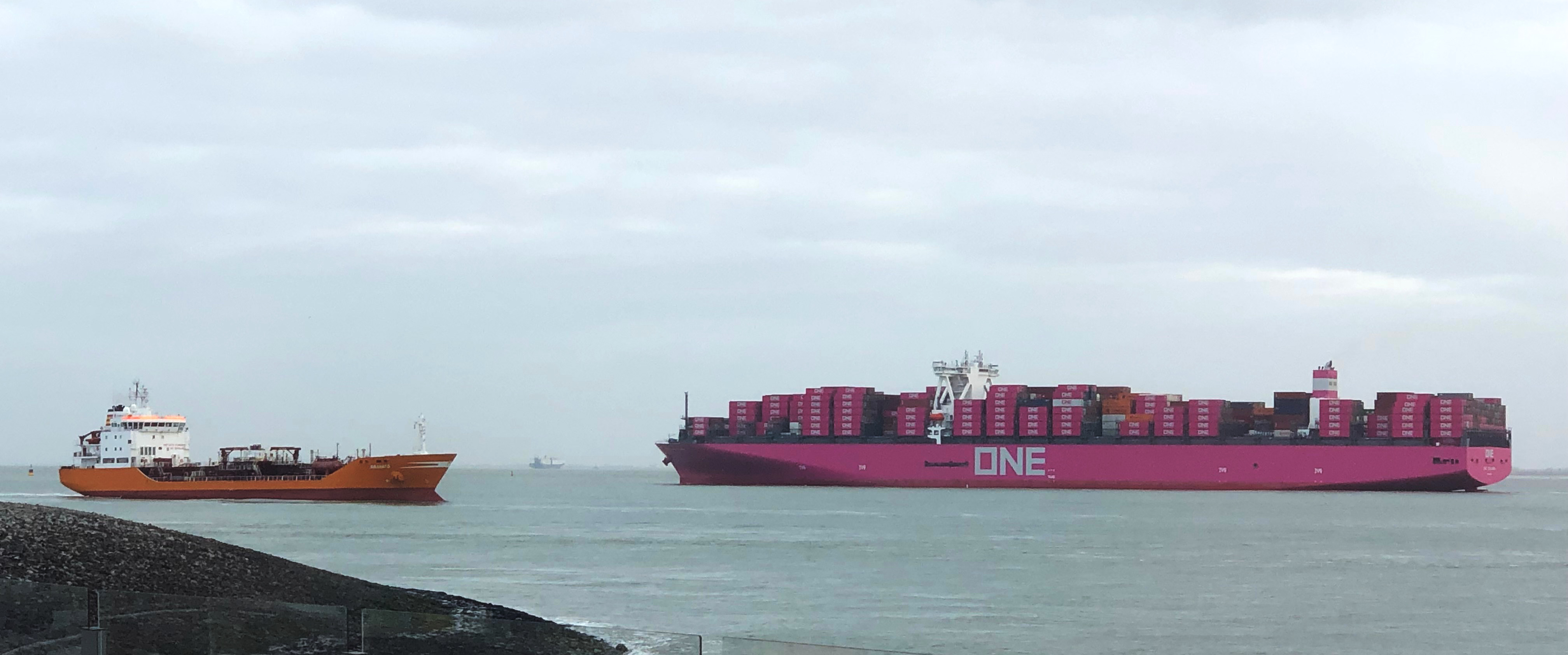 Kijk eens: aan boord hebben ze ook nog eens roze containers gezet! Dat moet een vrolijke boel zijn aan boord. Rederij One is nieuw en ontstond door een fusie van drie Japanse scheepvaartbedrijven. De kleur roze die de rederij gebruikt verwijst naar de bloesem van de Japanse sierkers. Dat klinkt exotisch, maar de Prunus staat ook in veel Nederlandse tuinen en parken.