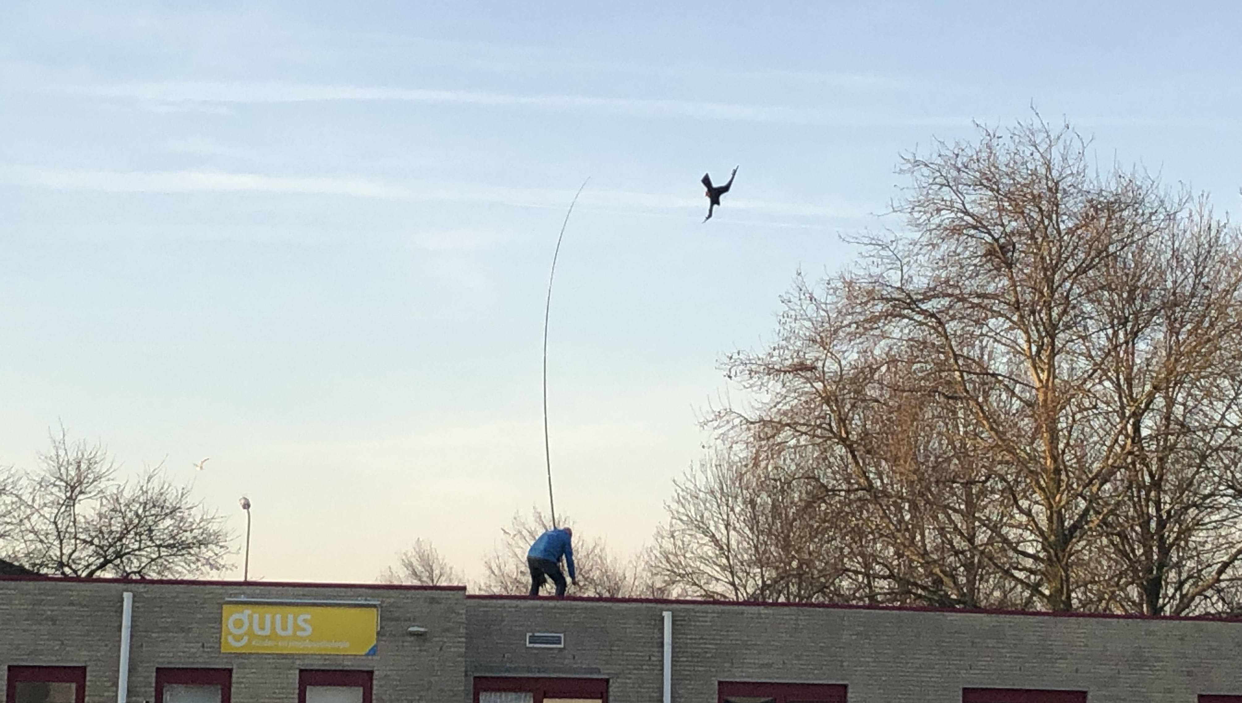 Simpel is voorbij, dus zie daar vogelverschrikker 2.0: man van vlees en bloed, in 2019 op het dak van een gebouw, met grote nepvogels aan een soort hengel.