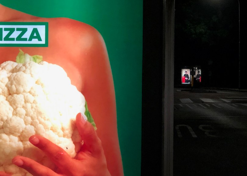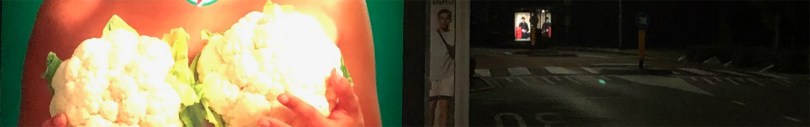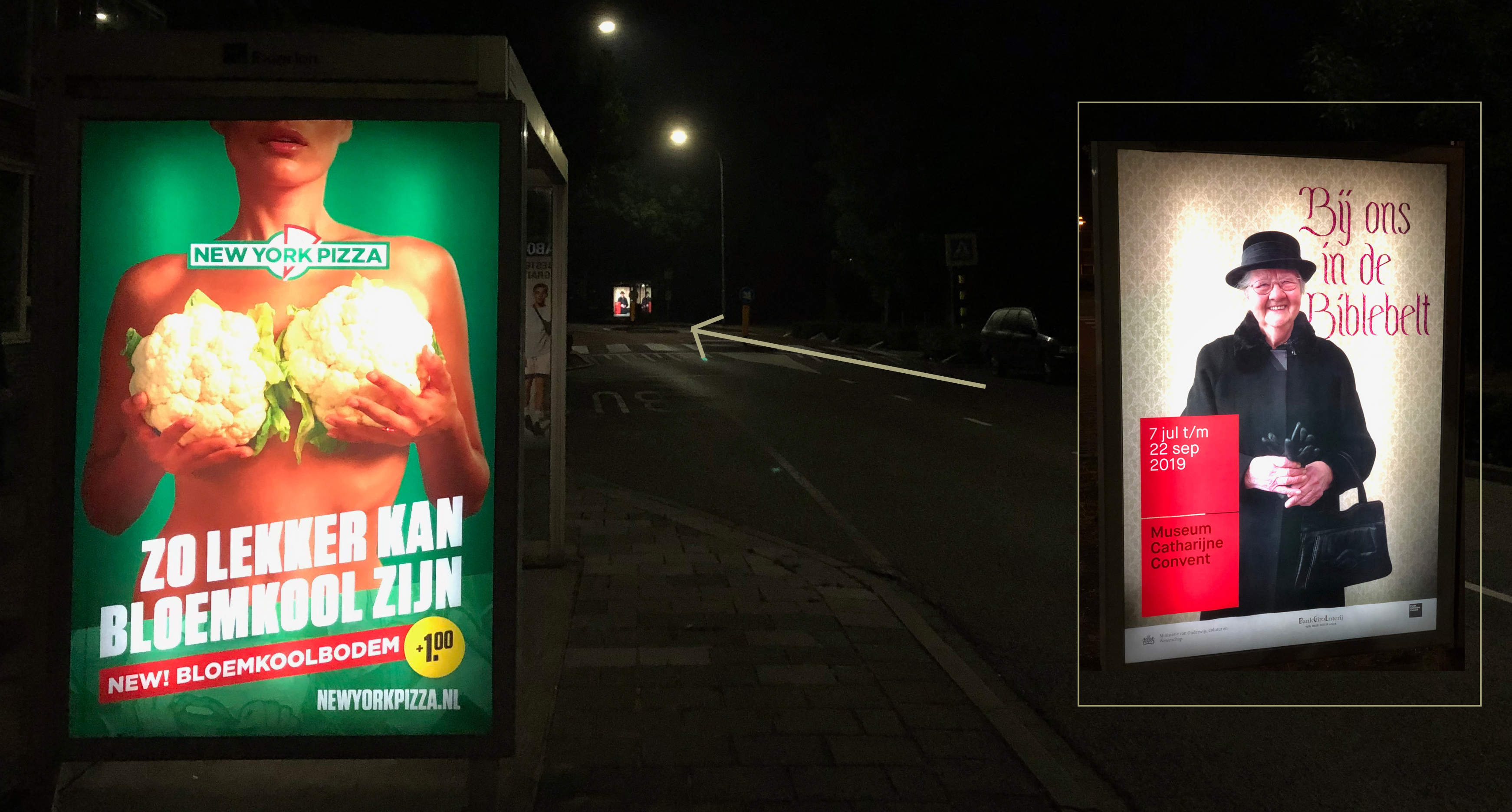 Een meter of veertig uit elkaar en je treft een wereld van verschil. In het bushokje de ene kant op hangt een blote vrouw met bloemkolen voor haar borsten, en vice versa verderop in de straat kijkt een vrouw je aan gehuld in dikke zwarte jas en dito hoedje. De ene reclameposter verleid je tot het eten van een pizzabodem van bloemkool, de ander tot een bezoek aan reli-tentoonstelling Bij ons in de Biblebelt. Twee pin ups met een eigen boodschap.