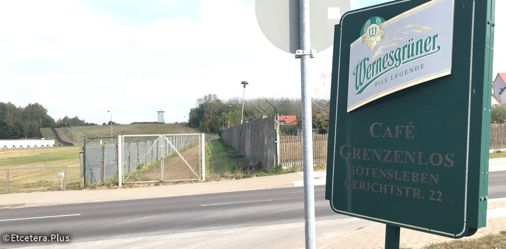 De oude grens maakt indruk. Een reclamebord verwijst naar café Grenzenlos. Duitsland is al jaren weer één land. Maar de herinneringen zijn springlevend.