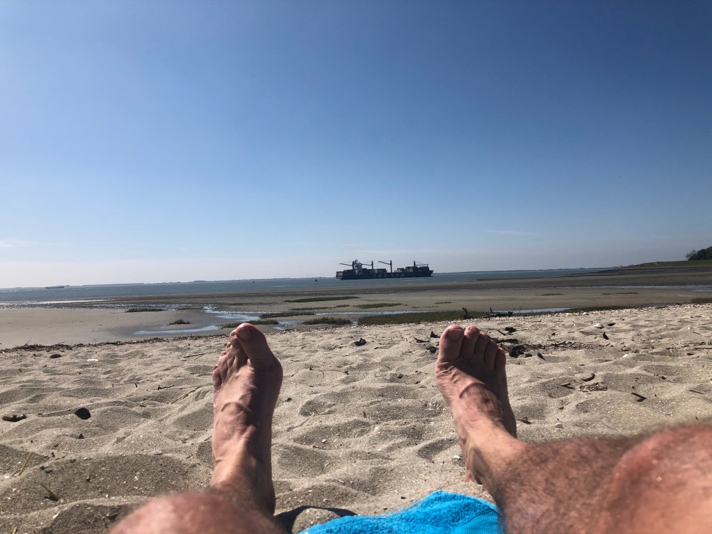 Een vleugje factor 50 waait voorbij en in de verte zoemt de zee. Schepen op weg naar dáár.