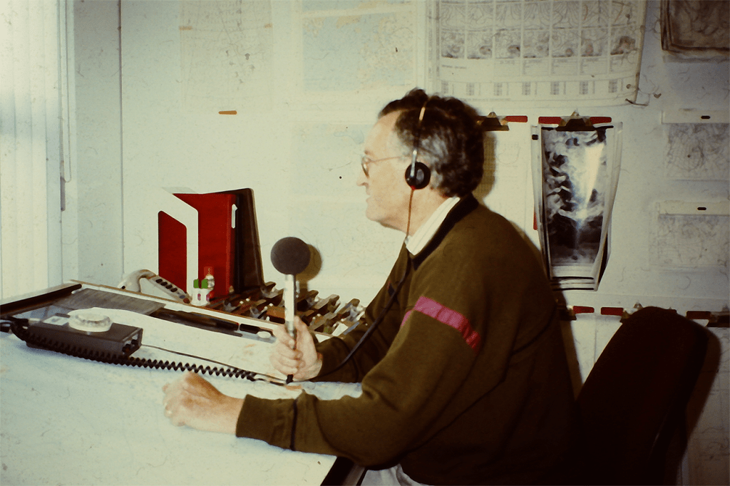 Dave Ludlam is één van de weermannen die voor het Hydro Meteo Centrum Zeeland in Middelburg het weerbericht verzorgen op Omroep Zeeland. Met een ‘reportofoon’ (een telefoon met microfoon en koptelefoon) heeft de weerman contact met de radiostudio in Oost-Souburg. Foto: collectie Omroep Zeeland.