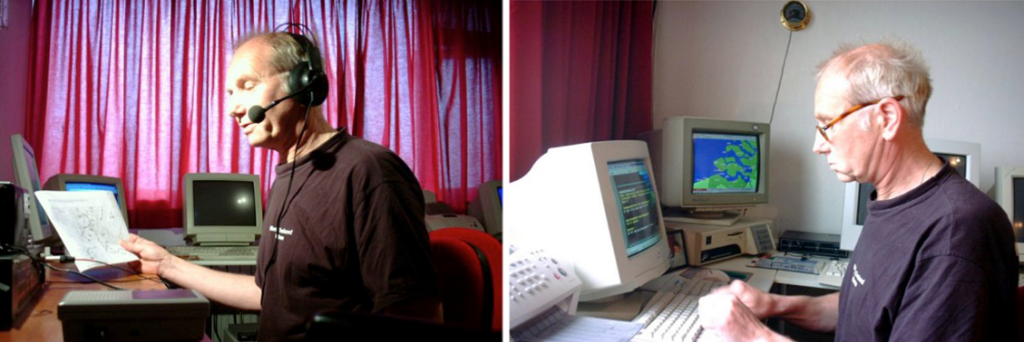 Jos Broeke verzorgt vanuit zijn weerkamer in Ritthem jarenlang het radioweerbericht (links) en houdt de teletekstpagina’s bij voor Omroep Zeeland. Foto’s: Remco van Schellen.