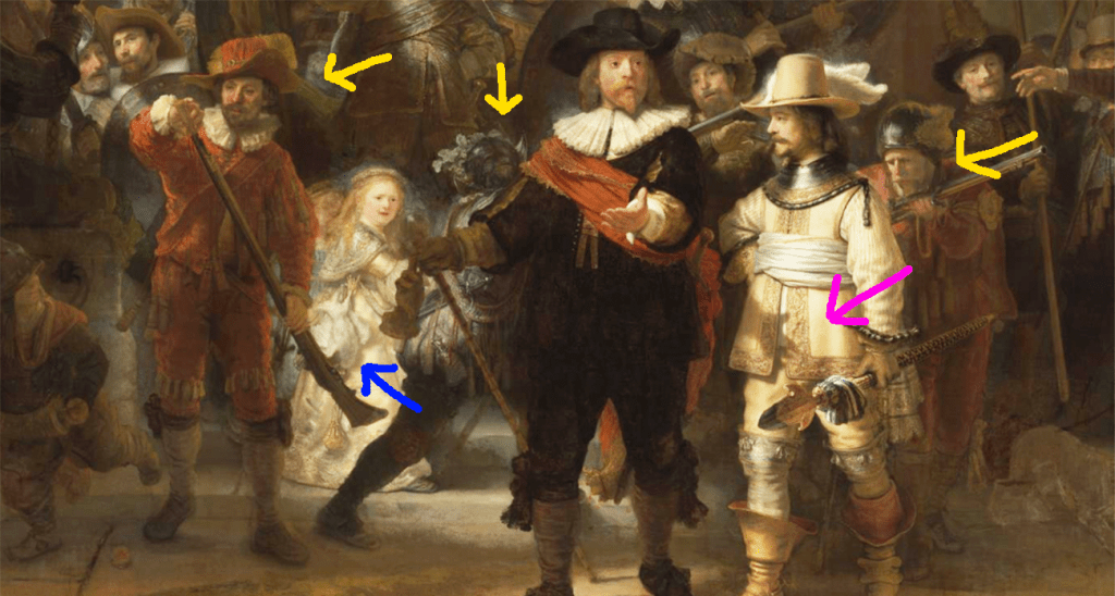 Clement wijst onder meer op het ‘vervolgverhaal’ met het geweer. Midden in het doek zie je van links naar rechts eerst een man die een geweer vult met kruit, een stukje daarnaast schiet iemand dat geweer af, en weer een stukje verder blaast een man het geweer schoon. Precies wat de schutterij doet: schieten met geweren, weer vullen, schieten, vullen, en zo verder. (zie gele pijlen op de afbeelding hieronder)