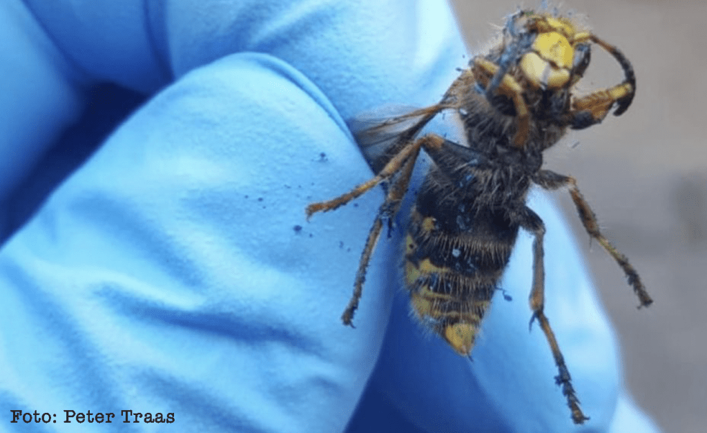 Het diertje is gevaarlijk voor onze honingbijen, zegt Traas. “De Aziatische hoornaar gaat bij een bijenkast wachten tot er een bij komt, en die neemt ie te grazen. Ook bij bloemen zitten ze te wachten”.