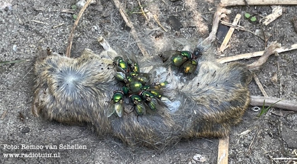 Hap! De kat van de buren verschalkt een muisje in de Radiotuin. En laat die liggen. Nou, dan weet je het wel: daar komen van die vieze vliegen op af. Alhoewel: die vleesvliegen ‘wassen’ steeds hun pootjes.