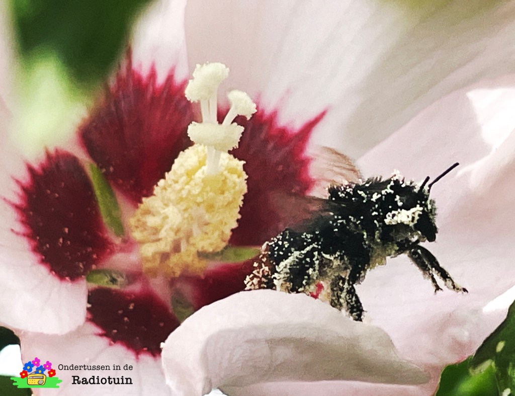 Bzzzzz, van bloem naar bloem in de hybiscus. Dat betekent stuifmeel verzamelen. Net zolang tot de hommel er helemaal onder zit.