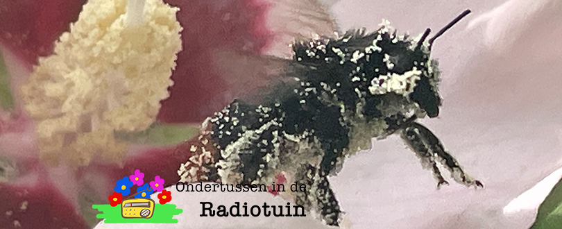 Bzzzzz, van bloem naar bloem in de hybiscus. Dat betekent stuifmeel verzamelen. Net zolang tot de hommel er helemaal onder zit.