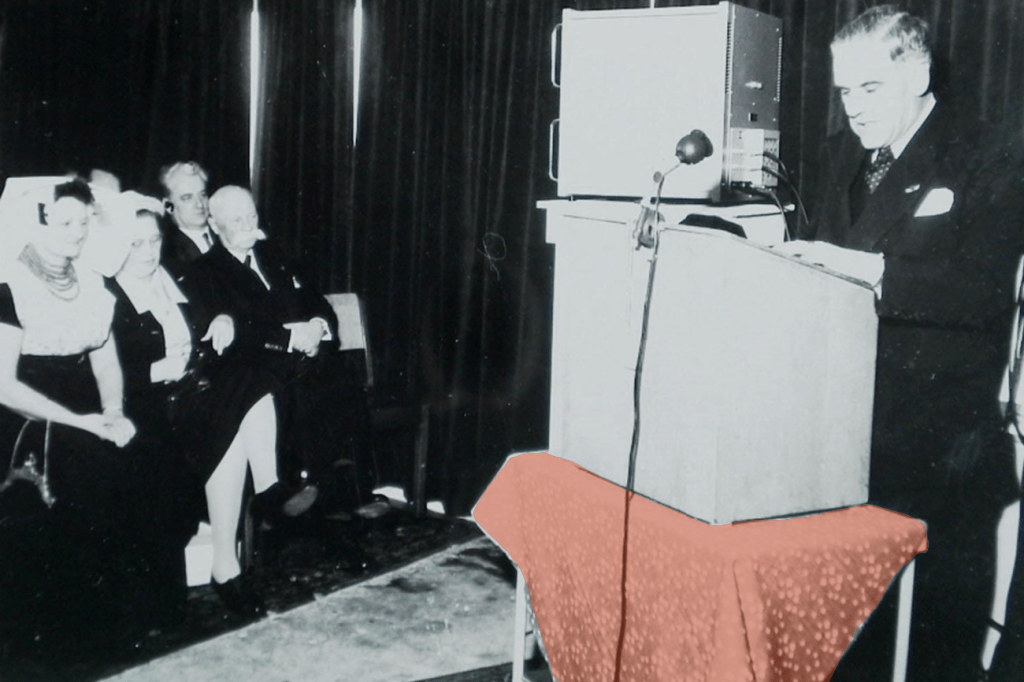 Even terug: bij de opening van de toren in 1957 is een reeks ‘belangrijke mensen’, zoals de directeur-generaal van de PTT en de commissaris van de koningin. Natuurlijk is op een foto van toen de Zeeuwse vrouw in dracht te zien, maar ook de katheder waarachter de officiële openingswoorden worden gesproken. Onder de katheder is een kleedje zichtbaar. Op de foto uiteraard zwart-wit, maar in het echt rood-groen. Katheder en kleedje zijn eigendom van het toenmalige hotel De Korenbeurs in Goes dat wordt gerund door Sieps moeder. “Rood-groen waren de kleuren van het hotel.”