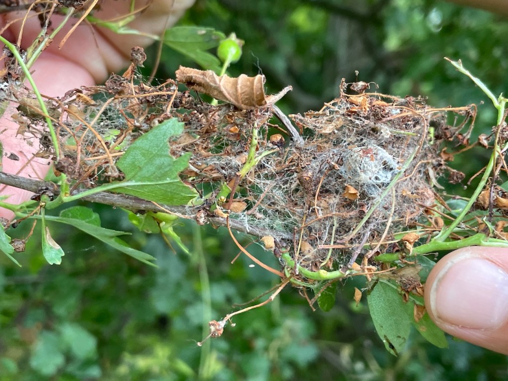Het ziet er best apart uit: takken vol witte draden. Het is geen spinrag, maar het beschermingsmechanisme van de . Als je iets beter kijkt zie je dat er geen spin bij zit, maar de stippelt Die maakt de spinsels om weg te kruipen. Eric en Remco zijn dit keer buiten de Radiotuin, in Serooskerke-Walcheren.