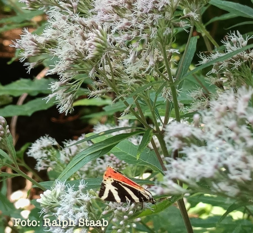 De wat? De Spaanse Vlag. Het insect lijkt absoluut niet op de vlag van het land Spanje, en toch heet het diertje zo. Tijdens een ommetje vloog het diertje langs Rob Bertijn en ging zitten. “Hallo, wie ben jij, dacht ik. Zoiets had ik nog nooit gezien. Je hebt allemaal apps waarmee je kunt zien wat voor vlinder het is. En het bleek een Spaanse Vlag te zijn!”