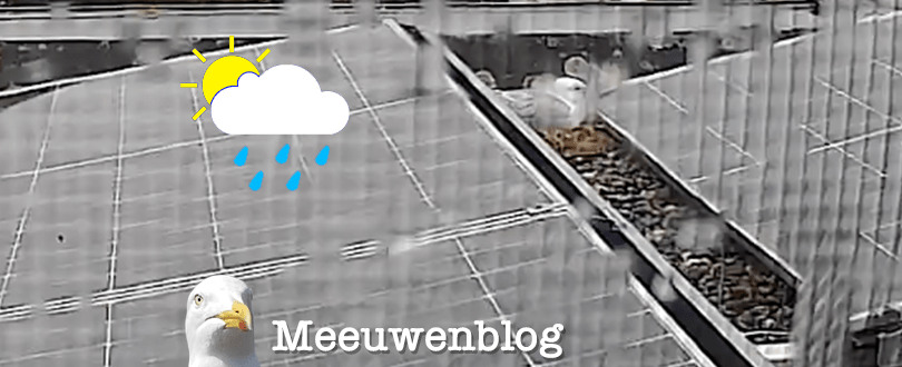 Voor ons Meeuwenblog is deze van belang: “Meeuwen aan land, storm voor de hand”. De meeuw op ons dak zit in elk geval stevig op het nest, ondanks wind en regen. De kop ‘in de schouders’ getrokken is die de eieren aan het warm houden.