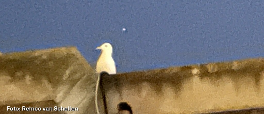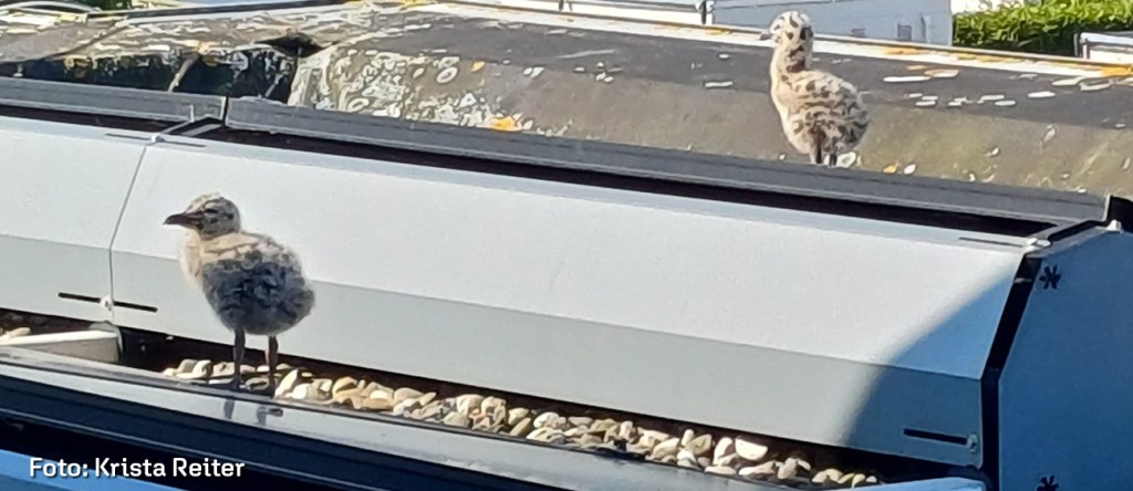 Het is kalm op het dak. Pa en ma vliegen heen en weer met voedsel (een visje dit keer), of poetsen de veren wat en liggen kalm over de kindermeeuwen uit te kijken. Af en toe, als er toch gevaar dreigt, is er een harde meeuwengil: “KJAWAA”.