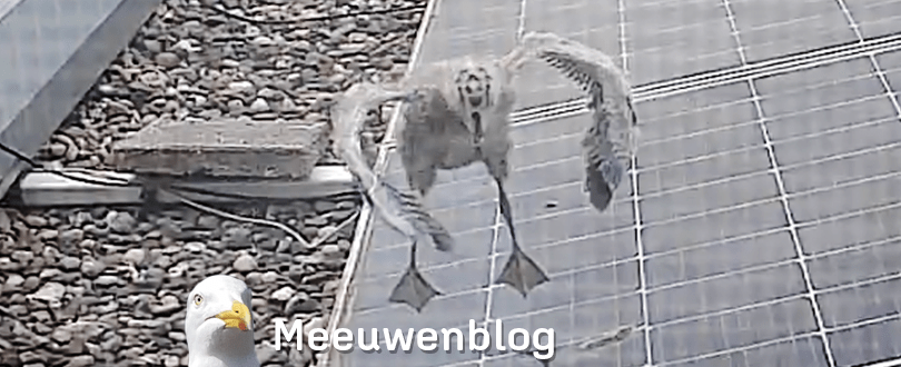Het is net of de jonge meeuw het podium pakt. Even vol in beeld en in de spotlights om zijn kunstje te laten zien: een vleugelgeklap en een sprongetje voor de MeeuwemCam. Huppekee… en weer landen met de flappers op het zonnepaneel. Applaus!