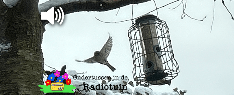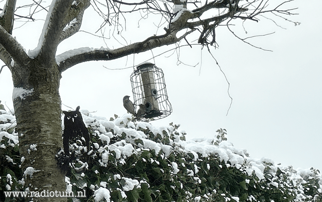 Winterprik in de Radiotuin; alles ligt onder een laag sneeuw. En dan heb je gelijk de vraag of je vogels moet voeren. Eric legt het uit aan Remco, bij de voedersilo die best geliefd is bij mussen en andere kleine vogels.