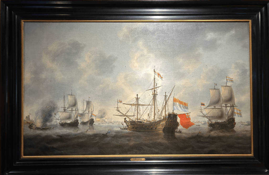 Jopie en Angel sturen ons naar een schilderij van die slag. Museum-gids Joëlle brengt ons via trappen en gangen naar de zaal, en dan staan we opeens voor de afbeelding waarop is te zien hoe de Nederlandse vloot onder leiding van Michiel de Ruyter Engelse schepen laat zinken. Centraal op het doek is zeilschip de Unity afgebeeld, dat door de Nederlanders is buitgemaakt, en waarop de Engelse vlaggen worden vervangen door Nederlandse.