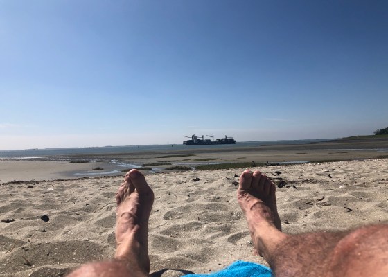 Zand. De zon valt op de nog lichte huid. De wind streelt door de haren. Voorzichtige strandgangers kijken om zich