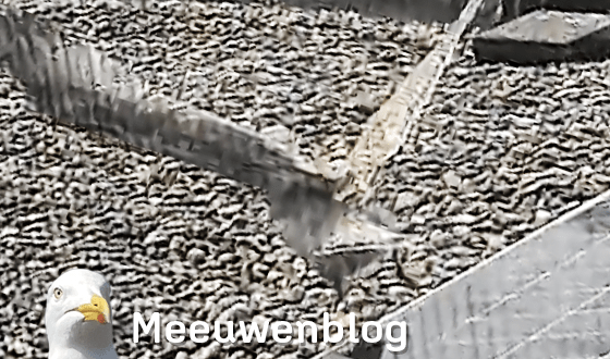 Het is zover: één van de meeuwen is van het dak gevlogen