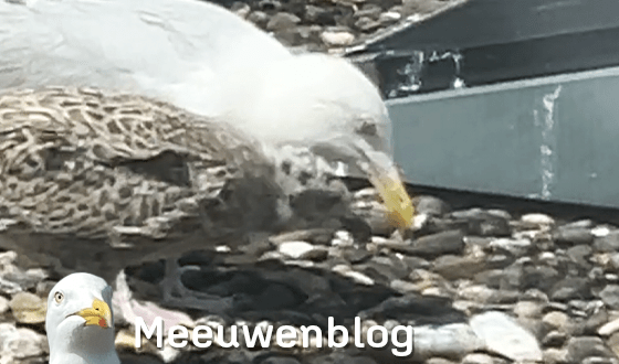 Vol geduld doet ouder-meeuw voor hoe je een stuk vis eet.